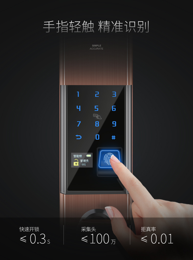 雖然如此,如果比較起來(lái)的話(huà),指紋鎖還是比密碼鎖好用。因?yàn)橹讣y鎖只需要指紋在指紋鎖頭上按一下就好了,而密碼鎖則需要輸入一連串的數(shù)字才行,從開(kāi)鎖的效率上要低一些。而且密碼鎖是需要記住密碼的,一家人使用,倘若是一個(gè)新的密碼,開(kāi)始用的時(shí)候會(huì)比較費(fèi)事。但如果是輸入指紋的話(huà),一家人是沒(méi)有這么大的使用門(mén)檻的。密碼鎖還有一個(gè)問(wèn)題就是,密碼如果被人看了去,就容易打開(kāi)家門(mén)。當(dāng)然在安全性上,以前的指紋鎖也不一定就比密碼鎖高多少,因?yàn)橐郧暗闹讣y鎖大多采用光學(xué)指紋頭,所以容易被復(fù)制的指紋打開(kāi)。但指紋與密碼的開(kāi)鎖方式,往往是出現(xiàn)在同一款鎖上的,這樣用起來(lái)也可以避免單用一種打不開(kāi)的情況——下圖的玻璃門(mén)智能鎖就是這樣,此外還帶了半導(dǎo)體指紋頭和虛位密碼設(shè)計(jì),安全性有了提高。